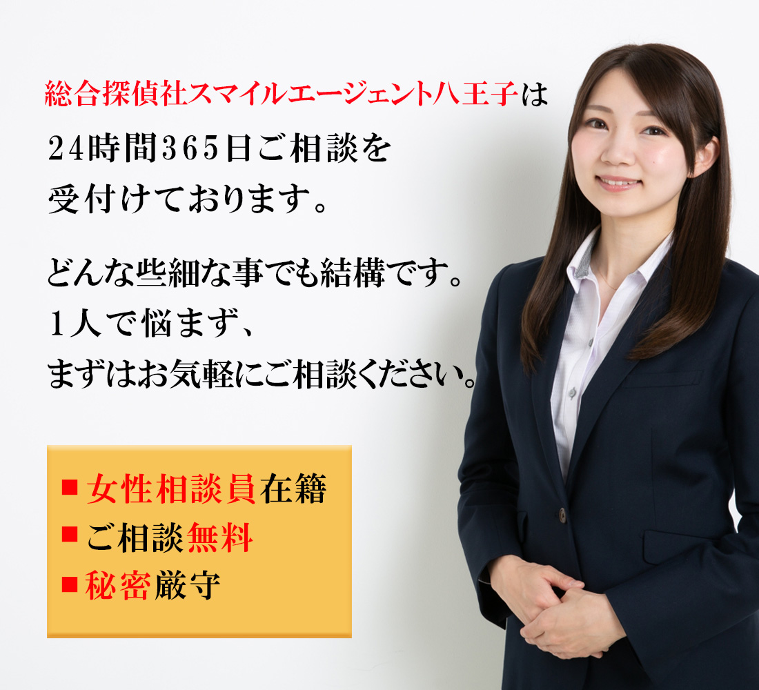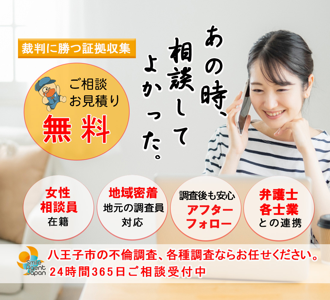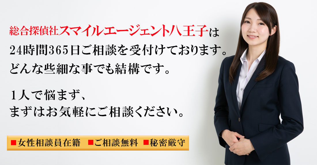 八王子市で不倫・浮気調査や行方調査、ペット捜索などの各種調査で探偵をお探しの際にはご相談・お見積りは無料となっておりますので一度、総合探偵社スマイルエージェント八王子までお気軽にご相談ください。